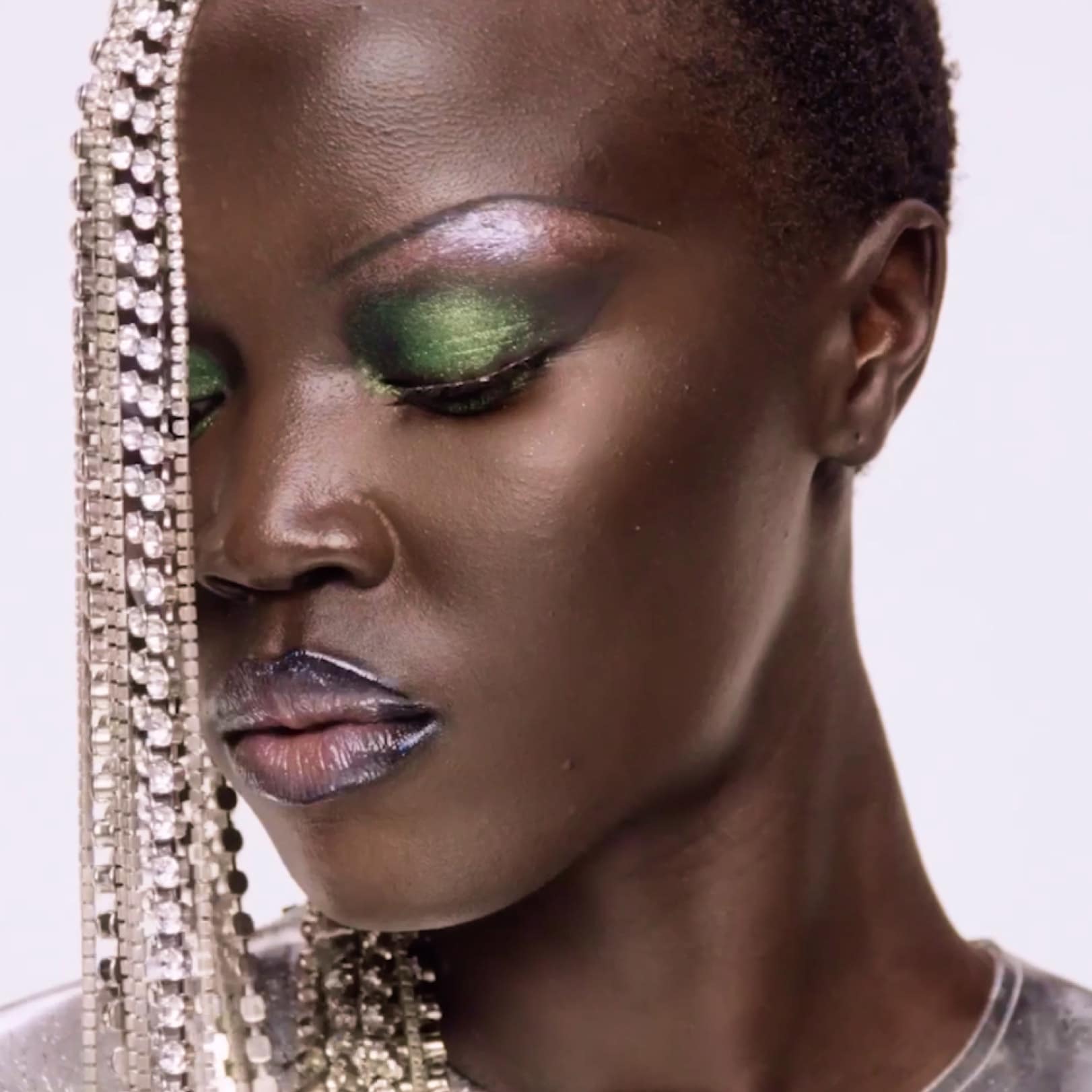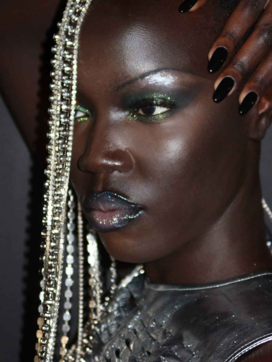 ミラーのようにツヤめくリップと、どの角度から見ても立体感やツヤが際立つアイメイクで仕上げる、未来感あふれるサイバールック。