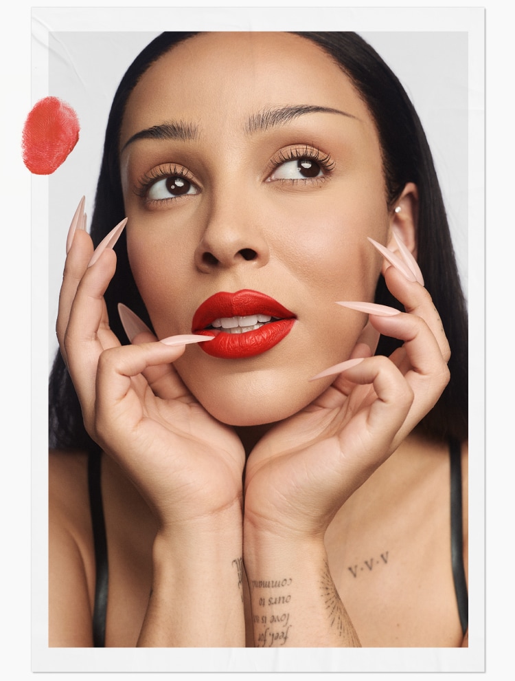煙あるところに火がある。火があるところにはレディ デンジャーがある。それは、マキシマル シルキー マット リップスティックの中でもベストセラーを誇る、燃えるようなレッドシェードであり、ドージャ・キャットのシグネチャーでもある。
